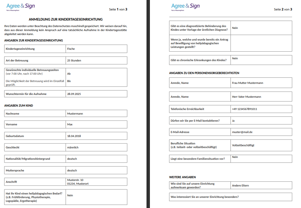 Completeness checks, automatic address validation, and multilingual support ensure error-free entries and smooth processing. The daycare center receives verified data directly into its system, eliminating the need for follow-up questions and delays. Parents benefit from transparent, fast processing and receive all relevant documents automatically by email.