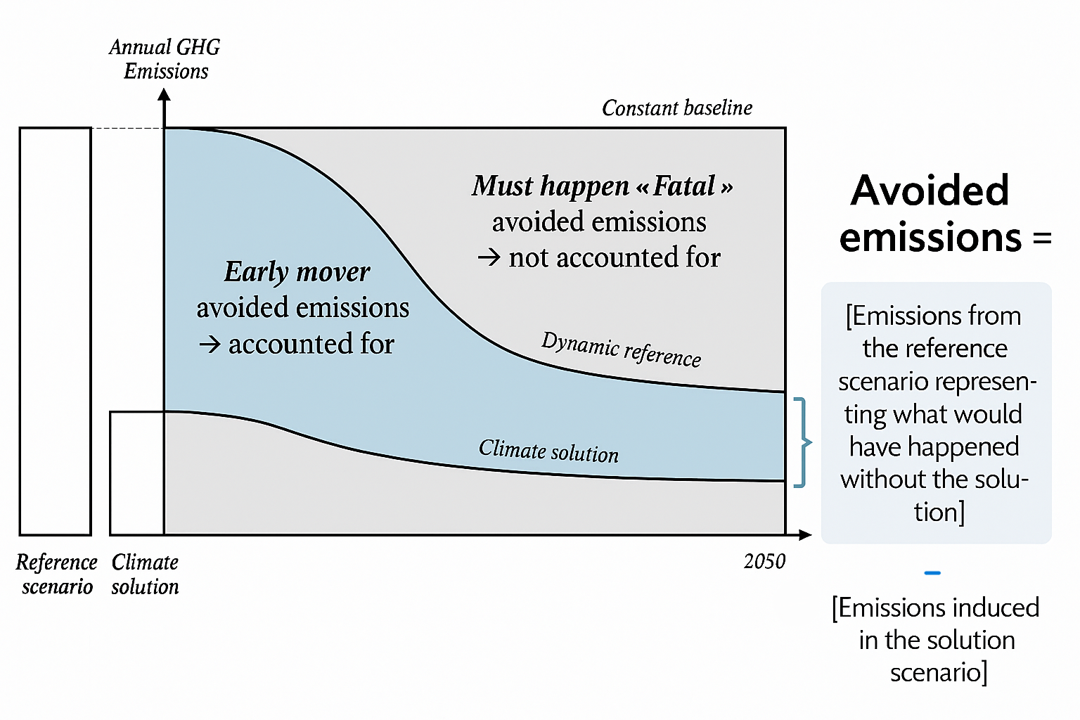 Thereby, the GHG Protocol lays out the groundwork for avoided emissions through comparative assessments, evaluating a product or service against a baseline alternative. Taking a step further, WBCSD expands on what a “scenario” entails: a counterfactual baseline (what would emissions be without the solution?), clear boundaries for processes and transparency (which market trends should be considered?), and dynamic behavior (reflect future changes instead of remaining static). 4
