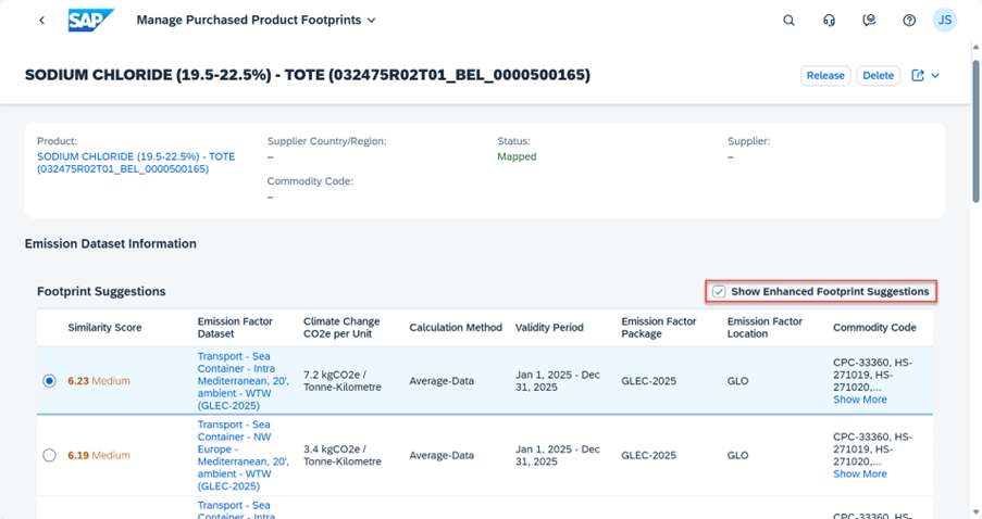 If Enhanced Footprint Suggestions are enabled and the AI-generated results do not appear plausible, this is often because the product’s commodity group is not available in any of the emission factor data packages delivered with the solution.